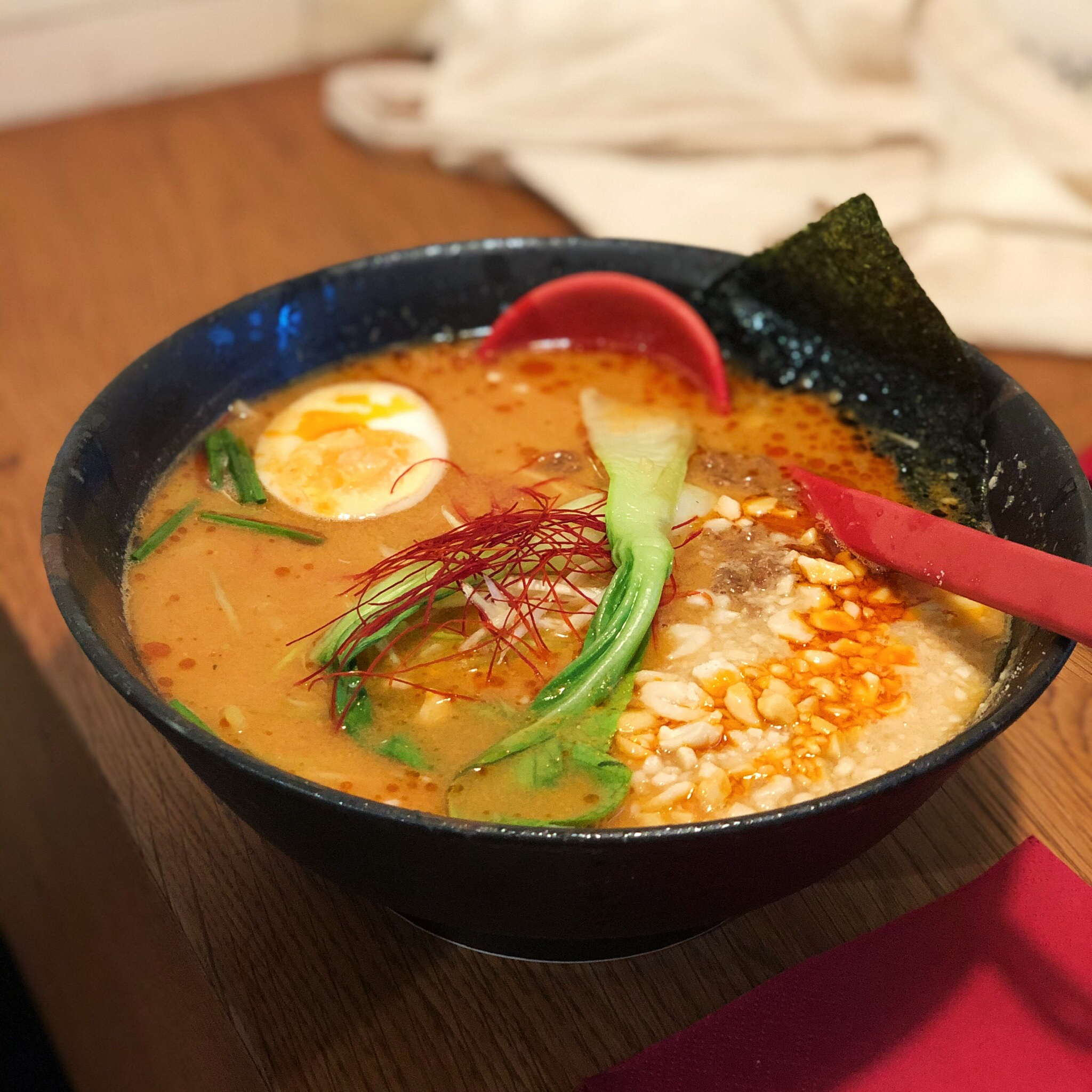 Eventuell isst der Mensch am Ende doch nur aus Hass, aus dem tiefen Wunsch heraus das Lebensmittel durch den Verzehr zu vernichten und verschwinden zu lassen. Anders kann ich es mir auch einfach nicht erklären, warum vor vielen Jahrhunderten mal ein Asiate schwimmen gegangen ist und sich dann dachte: “Das Zeug das mir da so eklig am Bein klebt, das koch ich jetzt mal aus und mach mir ne schöne Suppe draus.” Seien wir aber mal dankbar, denn die Kombu Alge ist ja der Hauptlieferant für die wunderbare Geschmacksrichtung Umami, die wir Europäer bis vor ein paar Jahrzehnten nur unter den Namen “mach da mal noch n bisschen Maggi drauf” kannten. Wobei ich mir bei der Ramen Station Takumi nicht so ganz sicher bin, ob das Gschmäckle wirklich von ausgekochten Seetang kommt, oder eher noch vom Vormieter. Das war nämlich das Käsefondue-Restaurant Schweizweit, und was da nach Monaten von vor sich hindampfenden Gruyère noch an Umami in den Wänden hängen muss, da schmeckt am Ende vermutlich auch n stilles Wasser vollmundig. Woher es auch immer kommt, die Ramen sind wirklich außergewöhnlich gut, die Nudeln haben Biss und es gibt neben den Klassikern die man fast überall findet auch etwas überraschendere Varianten wie zum Beispiel mit Muscheln. Nur die Karaage waren etwas fett. Ich frag mal kurz ob das Schweizweit noch ne Flasche Kirschwasser hat stehen lassen.