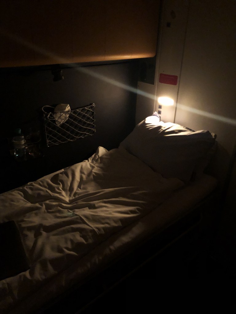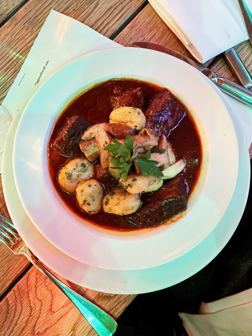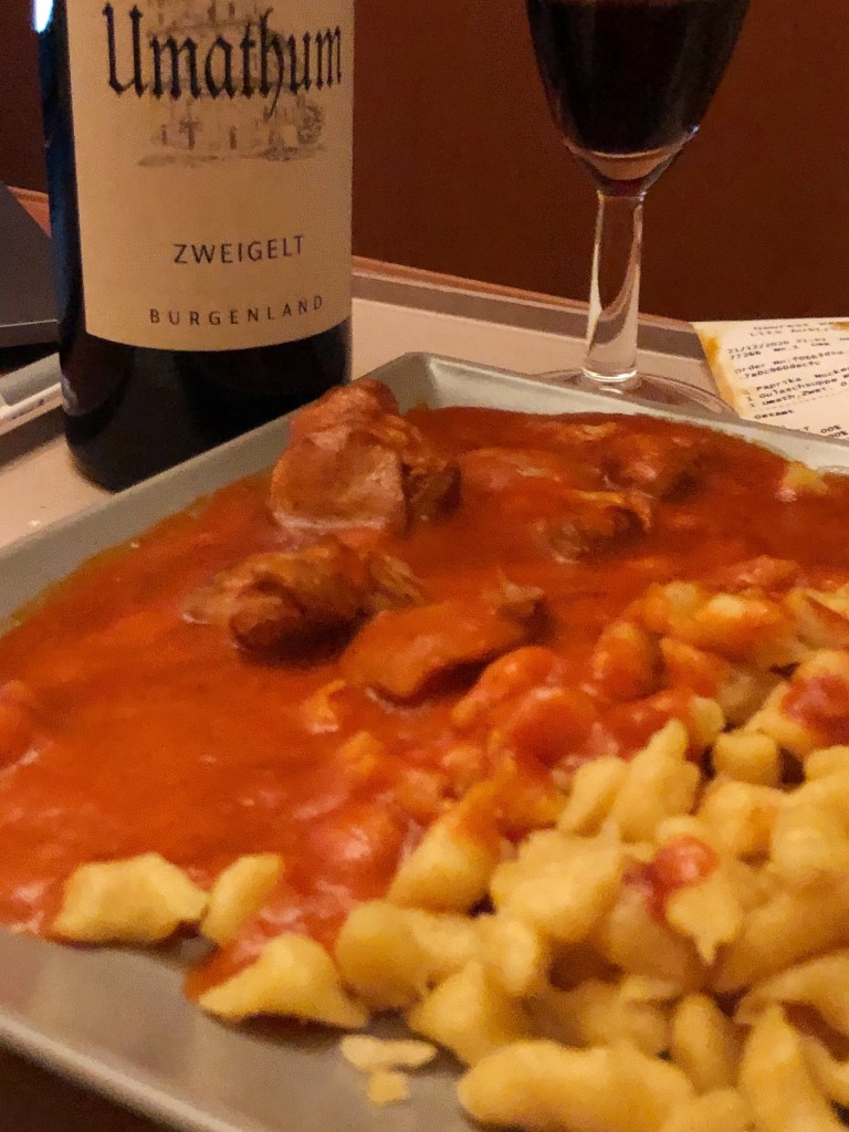 Die Concorde war zu schnell. Oder sagen wir besser: sie war zu wenig entschleunigt. Denn es lag nicht nur am Unfall in Paris, dass der Überschalljet nicht mehr fliegt. Die Concorde, dieses grazile Meisterwerk der Technik, diese weiße, wunderschöne Nadel, die der Schwerkraft lachend davonflog hat gegen ihren dicken, gemütlichen Artgenossen verloren. Denn statt kurz und sehr teuer in den economy-class-artigen Concorde-Sitzen zu fliegen, entschieden sich immer mehr Menschen einfach über Nacht etwas länger in den teuren, aber deutlich günstigeren und vor allem wesentlich gemütlicheren Full-Flat-Sitzen der effizienteren Unterschalljets zu fliegen. 2003 wohlgemerkt. Da war die High Speed-Globalisierung schon im vollem Gange, während Businessjohnnys Klimawandel immer noch für ne Funktion in ihrem 7er BMW gehalten haben. Und das ist die schöne Nachricht: es ist tatsächlich möglich, als Gesellschaft gemütlicher zu werden. Und vielleicht ist es ja soweit dass wir bald mal wieder häufiger den Nachtzug nehmen. Eine Einzelkabine ist nämlich nicht nur in Coronazeiten ein Traum und trotz der eher funktionalen Innenarchitektur lässt es sich der Verstand nicht nehmen, einen Hauch Orient Express-Gefühl aufkommen zu lassen. Aber jetzt mal ernsthaft, das hier ist immer noch ein Foodblog und ich komm jetzt endlich mal zum Essen. Der Nightjet wird zum Glück von den Österreichern betrieben und die haben, die ein oder andere Großkantinenberghütte mal ausgenommen, dann doch meistens noch ein bisschen mehr Anspruch als wir Piefkes. So gab es eine absolut akzeptable Gulaschsuppe und danach Paprikahuhn mit Nockerln, das zwar natürlich nicht so gut war wie das von @mkm__at, das man mir aber in jedem stehenden Restaurant servieren könnte und ich wäre mehr als glücklich. Dazu mit Umathum einen Rotwein, den man sofort in eine ausgesuchte Weinhandlung stellen könnte.